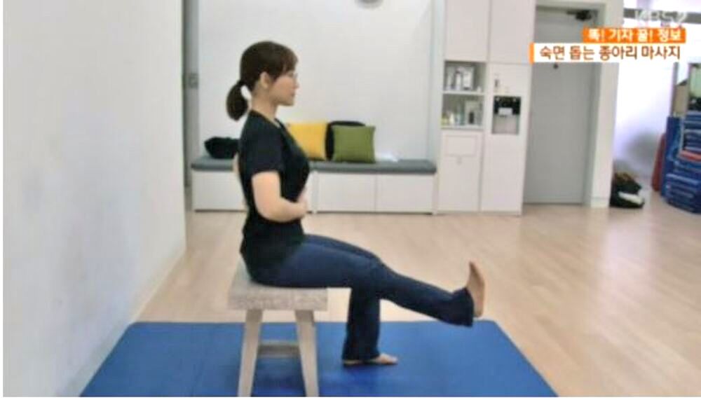 1. 종아리에 힘을 주면 뒤쪽에 갈라지는 근육(비복근) 가운데 부분을 10초에서 15초 사이로 눌러 종아리 뒤쪽 근육을 풀어준다.